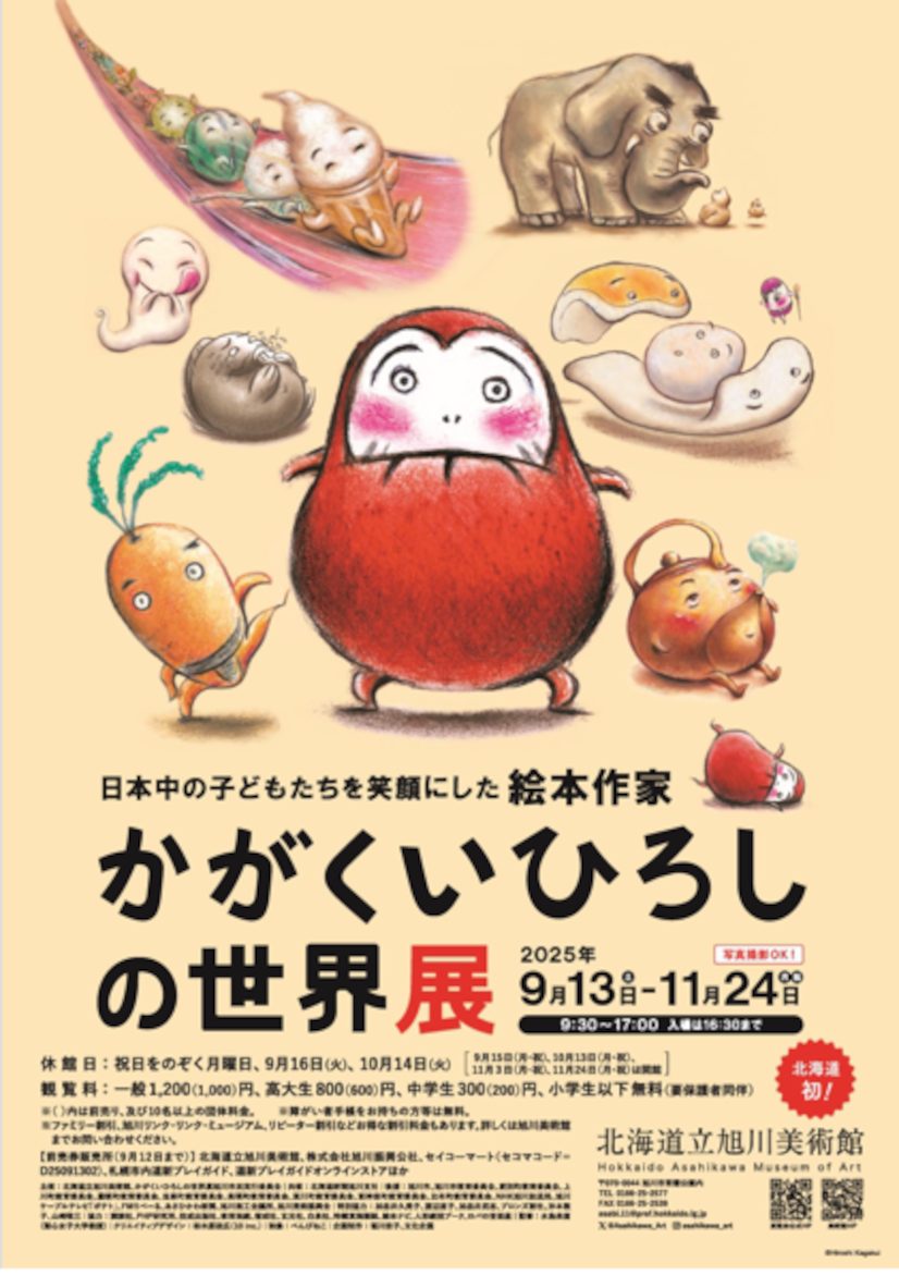 かがくいひろし(加岳井広、1955〜2009)は、特別支援学校の教員として障がい児教育の現場で培われた知見や実感に基づいて、50歳のとき『おもちのきもち』(講談社)で絵本作家デビュー。累計発行部数900万部を超える「だるまさん」シリーズ(ブロンズ新社)など、病で急逝するまでのわずか4年の間に16冊の絵本を残した。没後初の大回顧展となる今展では、絵本原画・制作資料とともに、教員時代の貴重な映像記録や教材などからその足跡をたどる。【展覧会公式サイト】