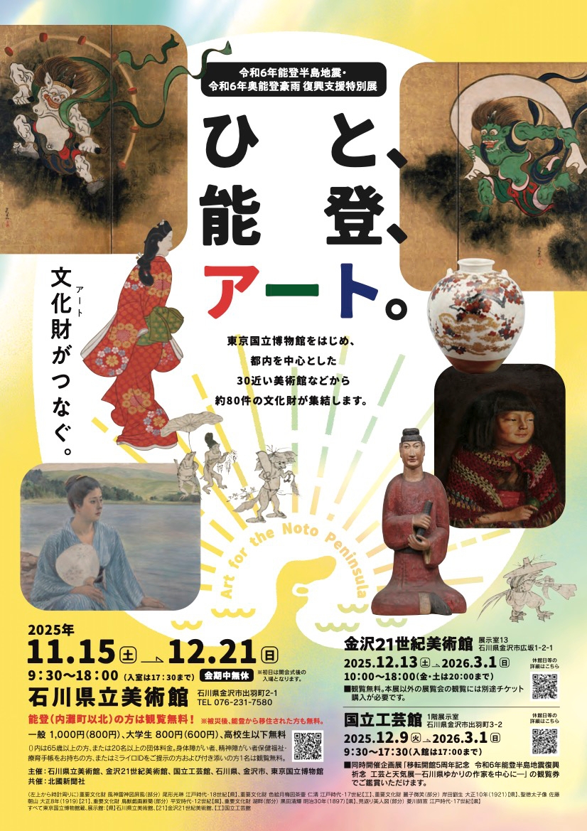 ひと、能登、アート。 金沢市 石川県立美術館 TEL.076-231-7580 開催期間:2025年11月15日(土)~12月21日(日) 2024年1月の能登半島地震、9月の奥能登地域の豪雨災害の復興を支援する展覧会。東京国立博物館をはじめ、都内を中心とした30近い美術館などから約80件の文化財を、金沢市内の3施設で展示する。【出品作品リスト】 没後40年 鴨居玲展—見えないものを描く— 2026年2月11日(土)〜