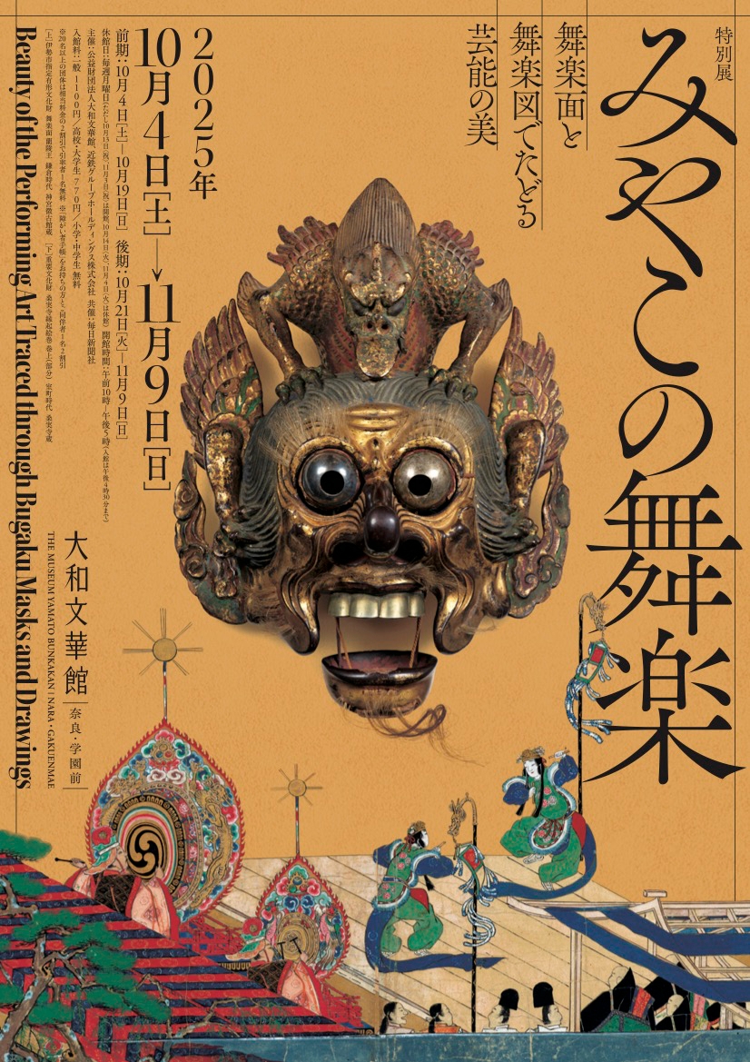 舞楽は奈良時代より宮中の諸行事や寺社の法会・祭礼において奏された日本で最も長い歴史をもつ芸能。中世以降、舞楽の発展を中心的に主導していた「三方楽所」と称される、大内(宮中)・南都(興福寺)・天王寺(四天王寺)の舞楽演奏組織やその楽人は、宮中のみならず天野社や嚴島神社をはじめ、近世には江戸や日光へと楽人を派遣し、舞楽継承に大きな役割を果たしてきた。今展では、こうした舞楽の発展を、舞楽を描いた《聖徳太子絵伝 第五・六幅》(鎌倉時代、1323(元享3)年、大阪・四天王寺蔵)、《桑実寺縁起絵巻》(室町時代、1532(天文元)年、滋賀・桑実寺蔵)などの舞楽図や、平安時代から江戸時代までの舞楽面など、重要文化財を多数含む69件の出陳品によって紹介。京都・奈良・大阪を中心に育まれた豊かな芸能文化の精華に触れる。