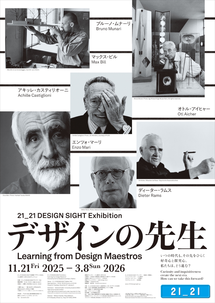 ブルーノ・ムナーリ(1907〜98)、マックス・ビル(1908〜94)、アキッレ・カスティリオーニ(1918〜2002)、オトル・アイヒャー(1922〜91)、エンツォ・マーリ(1932〜2020)、ディーター・ラムス(1932〜)の6名を、信念と希望を胸に活動することで各時代の先を探り、社会の新たな局面をもたらした人物であるという共通点に着目し、「デザインの先生」として紹介する。