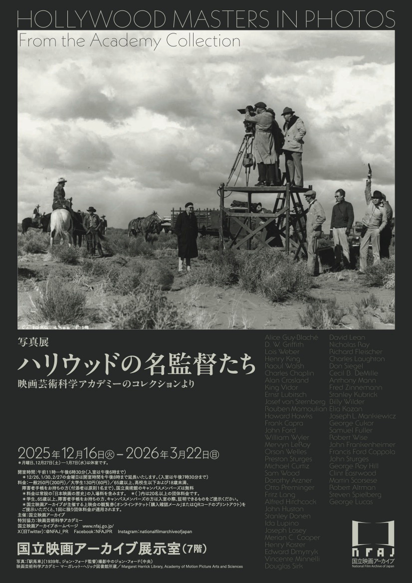 アカデミー賞の開催で知られるアメリカの映画芸術科学アカデミーは、映画のアーカイブ機関や映画資料の収集・保存を専門とする図書館も擁している。今展では、同アカデミーの膨大な写真コレクションより黄金期ハリウッドの名監督や伝説的なスターの撮影現場を収めたスナップ写真などを公開。