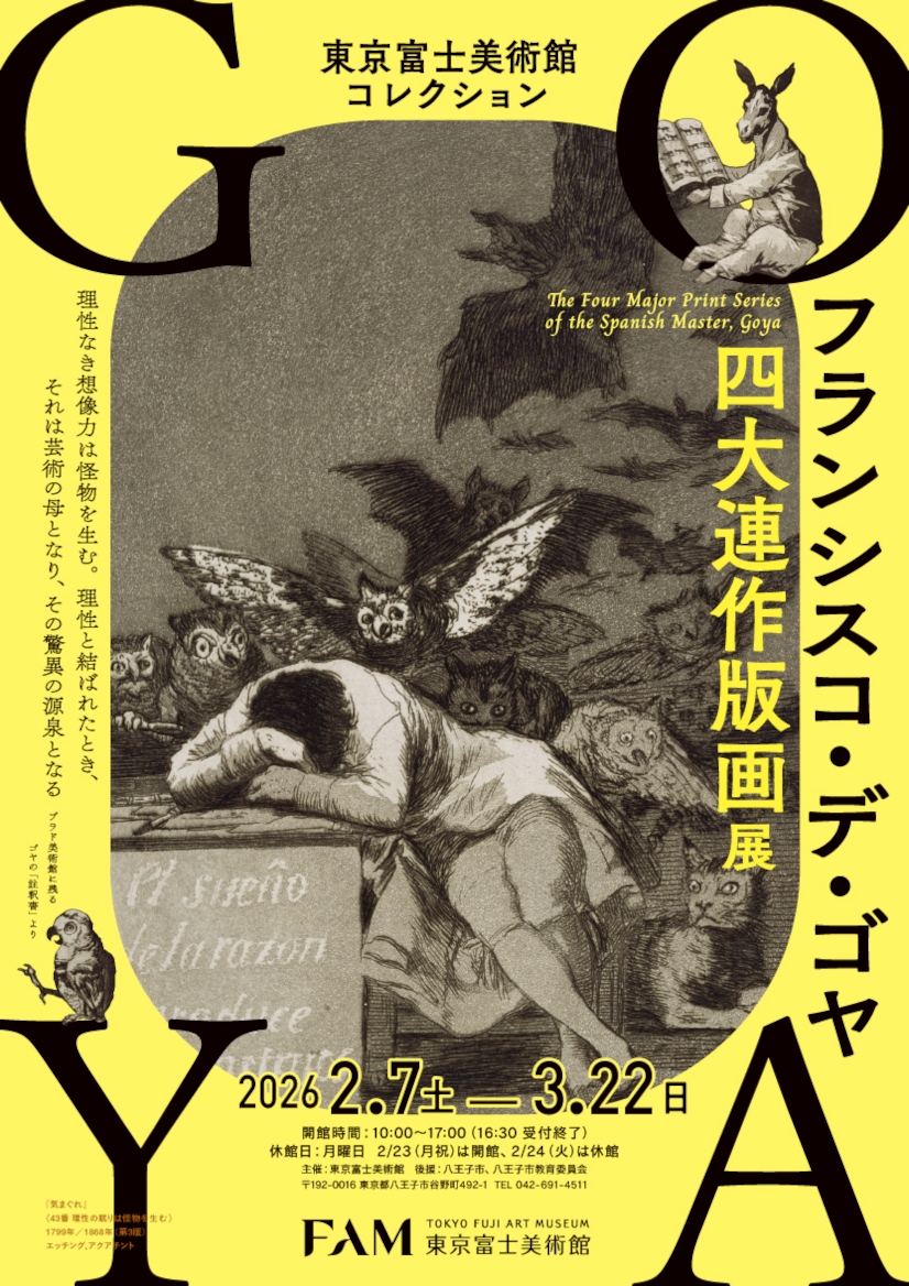 スペインを代表する画家フランシスコ・デ・ゴヤ(1746-1828)は、傑出した版画家としても知られている。『気まぐれ』Caprices、『戦争の惨禍』Disasters of War、『闘牛技』Bullfighting、『妄』The Folliesの連作版画シリーズには、社会に対する鋭い批判や戦争の残虐さ、人間精神の内面が、深い洞察に基づく表現力で鮮烈に描き出されている。今展では、東京富士美術館が所蔵するゴヤの四大連作版画215点を一挙公開し、時代を超越した独特の魅力を放つゴヤ版画の全貌を紹介する。