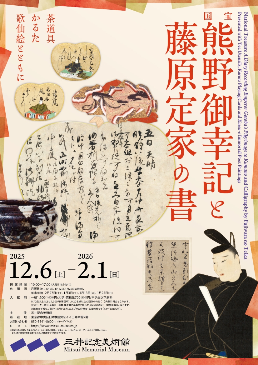 三井記念美術館が所蔵する6点の国宝の一つ、藤原定家筆・国宝《熊野御幸記(くまのごこうき)》(1201(建仁元)年)を、開館20年の年に久方ぶりに全巻展示する。《熊野御幸記》は、後鳥羽上皇の熊野参詣に随行した公家・歌人の藤原定家(ふじわらのさだいえ/ていか、1162〜1241)の旅日記。この公開に合わせて館蔵品の中から、後鳥羽上皇と藤原定家の書を選んで展示する。なかでも、藤原実資(さねすけ、957〜1046)の日記『小右記(しょうゆうき)』から1012(長和元)年の大嘗会(だいじょうえ)の記録を定家が筆写した《大嘗会巻》は、三井記念美術館では初公開となる。また、定家の歌切や消息、3幅の藤原定家画像も今回が初公開。江戸時代以来、小堀遠州などの茶人の間で好まれた「定家様(ていかよう)」をうかがえる茶道具や、百人一首かるたや歌仙絵も展示する。