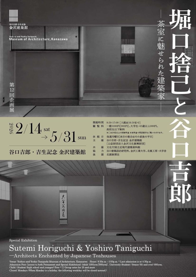 金沢出身の建築家・谷口吉郎(1904〜79)は、とくに戦後における新しい茶室や和風建築を創出したことで知られている。同様に日本近代を代表する建築家の堀口捨己(1895〜1984)も戦時中に茶の湯研究に注力し、現代数寄屋建築設計の第一人者となった。今展では、戦後の和風建築を牽引した二人の建築家の歩みをたどる。
