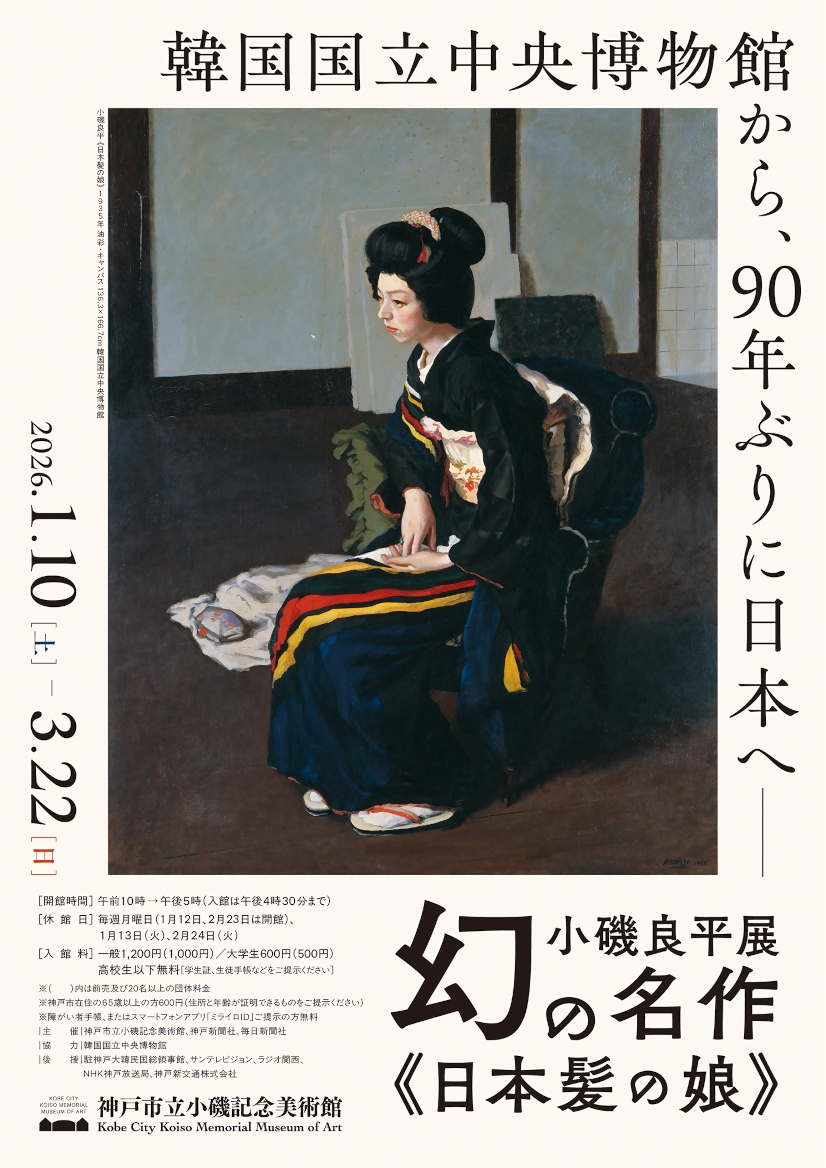 人物画とりわけ気品と静謐さに満ちた女性像で知られる洋画家・小磯良平(1903〜88)の画業をたどる上で欠かすことのできない名作《日本髪の娘》(韓国国立中央博物館蔵)。神戸にあった戦前の小磯のアトリエで描かれ、1935年の「第一回第二部会展」に出品され、時をおかず李王家美術館が購入し、海を渡ったところまではわかっていたが、その後の消息は判然とせず、幻の作品と考えられていた。2008年、韓国国立中央博物館が李王家美術館コレクションの洋画を特別展「日本近代西洋画」で展示したことにより《日本髪の娘》が再発見された。約90年ぶりに日本で展示される《日本髪の娘》と、神戸市立小磯記念美術館の所蔵品を中心に小磯良平の画業を改めて振り返る。