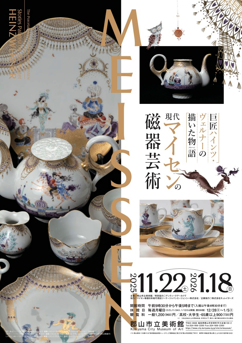 ドイツ・ザクセン州の古都マイセンに、1710年、熱心な東洋陶磁愛好家のフリードリッヒ・アウグスト1世(通称:アウグスト強王、1670〜1733)の命により王立磁器製作所が設立され、17世紀に有田で生産された「柿右衛門様式」の色絵による硬質磁器が作られるようになった。ヨーロッパ初の硬質磁器焼成に成功し、数多くの名品を世に送り出してきたマイセン磁器製作所は、1960年、創立250年を迎え、5人のアーティストによって新たな時代を迎える。今展ではそのひとり、巨匠ハインツ・ヴェルナー(1928〜2019)が創造した《アラビアンナイト》《ブルーオーキッド》など多彩なサービスウェアやプラーク(陶板画)など数々の名作を中心に、現代マイセンの美しい磁器芸術を紹介する。
