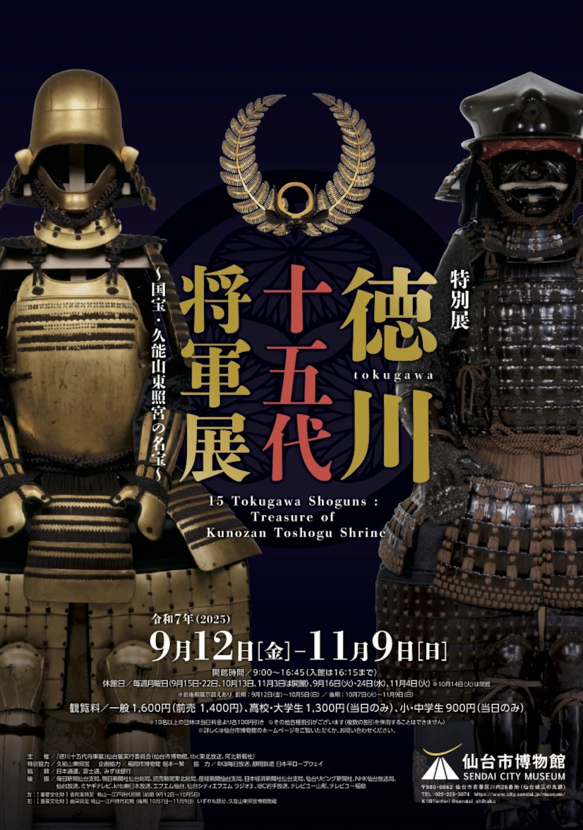 静岡県の久能山東照宮は、「東照大権現」として神格化された徳川家康を祀る全国にある東照宮の中で最も創建が古い。1616(元和2)年に駿府城で75年の生涯を閉じた家康の亡骸は、遺言によりその日の晩に久能山に移され、ここに埋葬された。翌年12月に二代将軍・徳川秀忠の命により久能山東照宮が創建。2010(平成22)年にはその本殿・石の間・拝殿が国宝に指定されている。付属する博物館には、奉納された家康所用の甲冑や晩年の手沢品、徳川歴代将軍の武具、直筆の書画など、2,000点以上が収蔵されている。今展では、こうした宝物の中から、国宝2点・重要文化財31点を含む約100点を一堂に展示する。