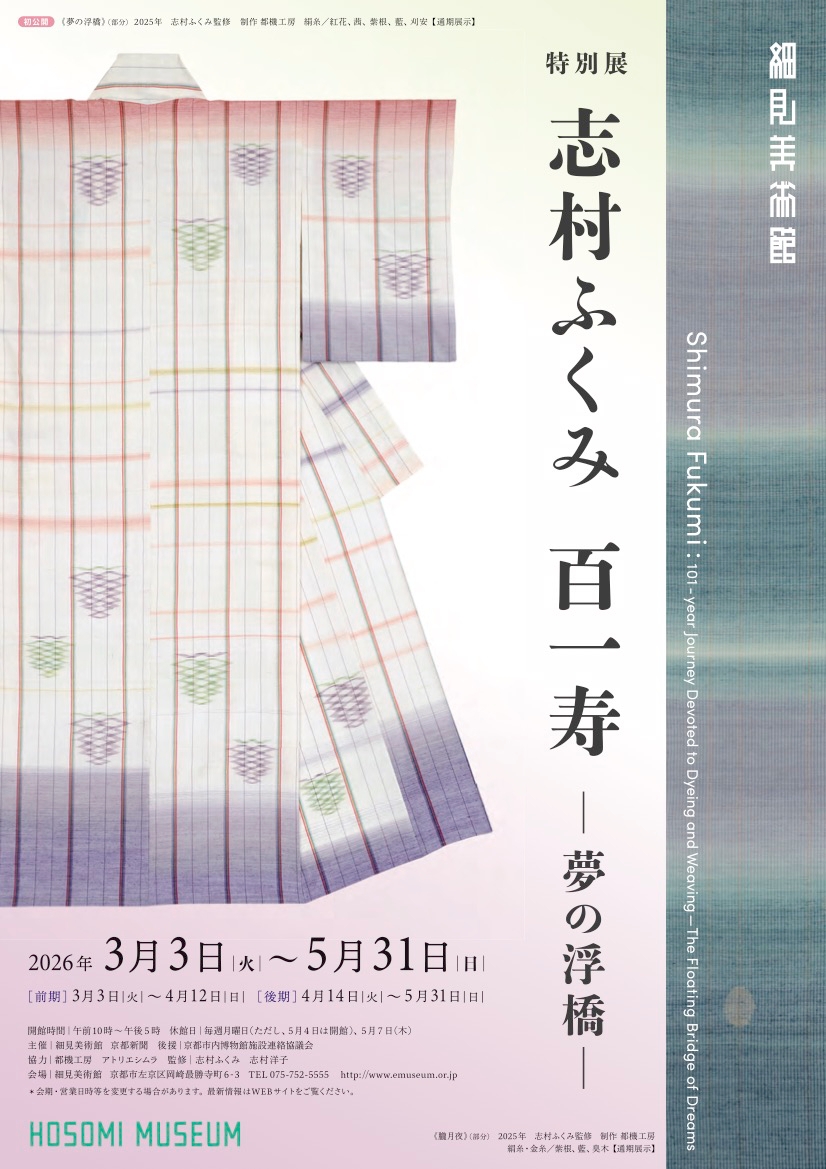 紬織の重要無形文化財保持者(人間国宝)で、随筆家としても知られる染織作家・志村ふくみ(1924〜)。昨秋101歳を迎えたのを言祝ぎ、70年の歩みを称える今展では、『源氏物語』や「紫」、石牟礼道子(いしむれ・みちこ、1927〜2018)原作の新作能『沖宮(おきのみや)』の装束など近年の特徴的なテーマを中心に、作品と綴られた言葉によって、色彩、生命、自然へのつきることのない思索と未来へ語り伝える想いを紹介。今展を機に構想・制作された作品2領を初公開する。