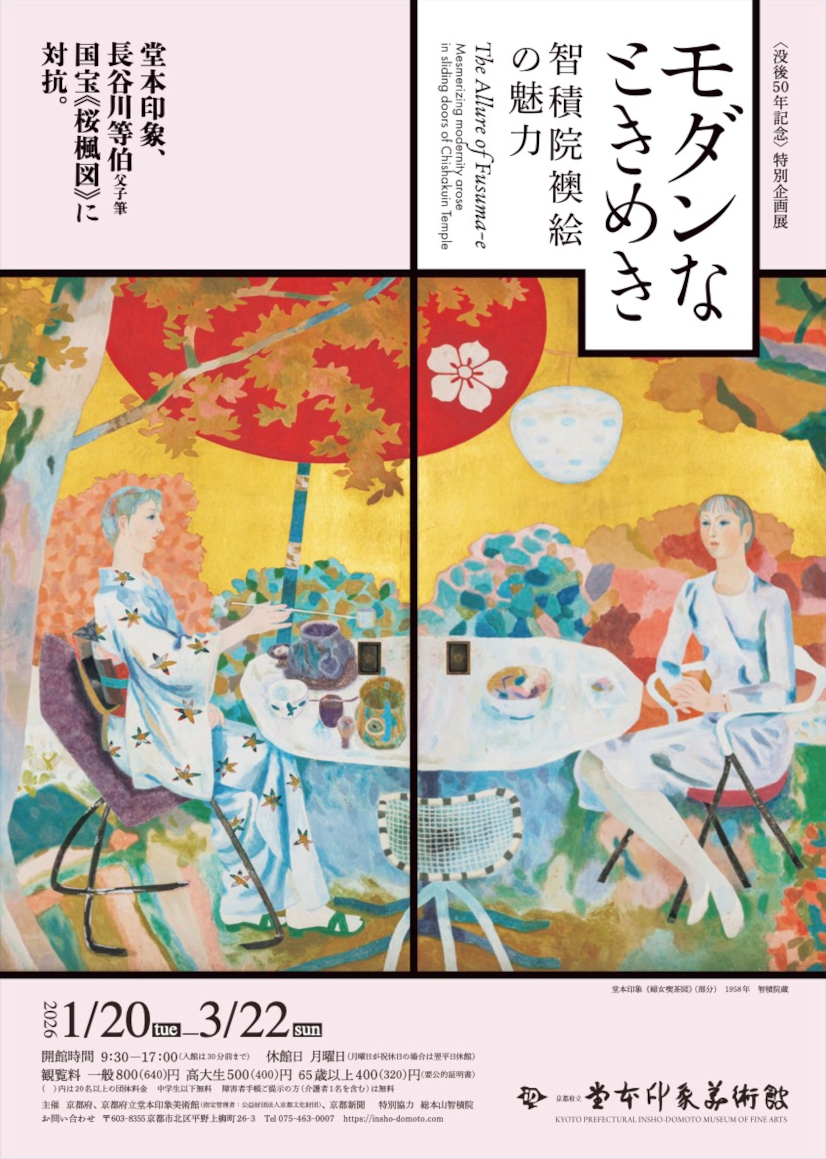 大正から昭和にかけて京都で活躍した日本画家・堂本印象(1891〜1975)は、生涯にわたり全国13ヵ所の社寺の襖絵制作を行っているが、今展では、そのなかでも今なお高い人気を誇る智積院の襖絵を紹介。1958(昭和33)年、智積院境内に賓客を迎える場として宸殿が再建され、そこに飾る襖絵として依頼された印象は、宗教活動は時勢と無縁であってはならないという寺の意に応えて、思い切りモダンな構想で描くことを決めた。