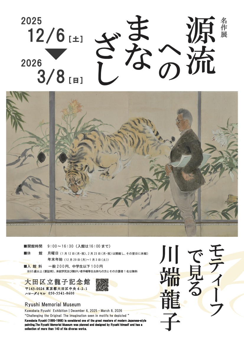 洋画家から出発し、挿絵画家の時代を経て、独学で日本画の世界を開拓し続けた川端龍子(1885〜1966)が、古くから脈々と描かれてきた「古典的モティーフ」をどのように描いているのか、そして「現実にあるモデル」では、実在する対象をどのように表現しているのかについて着目した展覧会。たとえば、出品作品の《やすらい》(1958年)は、龍子が高野山の快慶《孔雀明王》(鎌倉時代、重要文化財)を見て、平安時代から騎乗の姿で表されてきた「孔雀明王」を休息する様子として描き、それまでの仏画にはない龍子独自の創造が表されている。また、《虎の間》(1947年)では、京都・南禅寺の狩野探幽《群虎図》(寛永年間、重要文化財)のうち「水呑の虎図」を絵の中に引用し、その襖の手前に龍子自身を描いている。画中の虎は、龍子に睨みをきかせ警戒しているように描かれ、その構図は、虎と対峙する自らを「龍」とする、伝統的な「龍虎図」の構成を取り入れている。