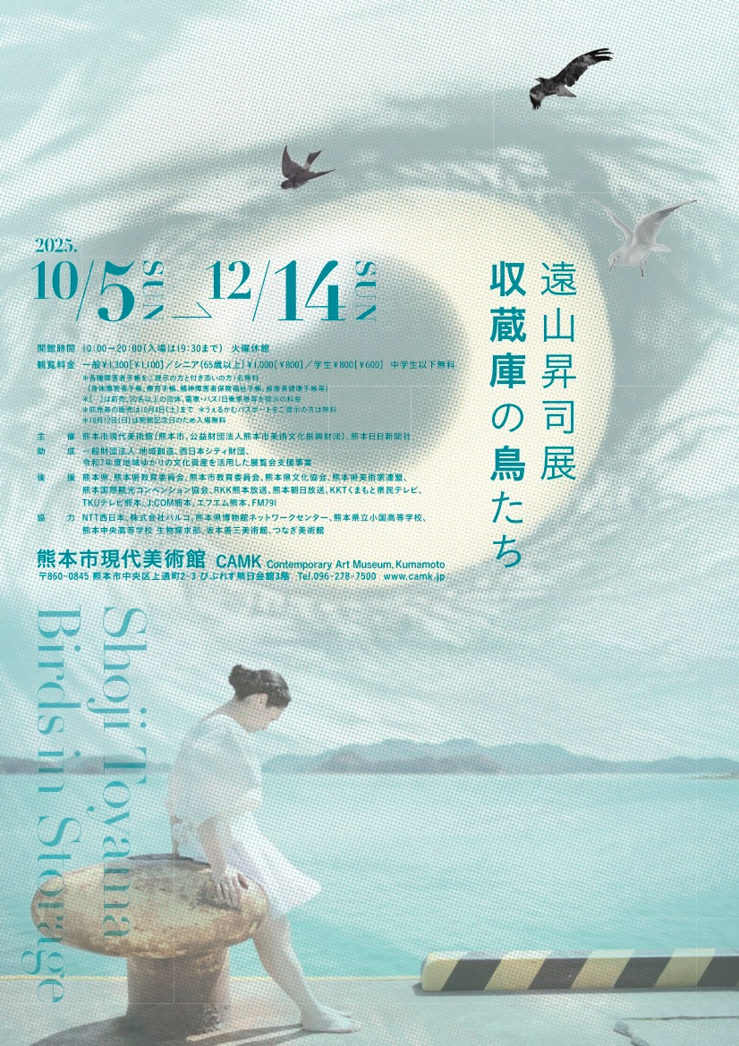 熊本県八代市出身の映画監督・アートディレクターの遠山昇司(1984〜)が、美術館に眠る収蔵品から、自身の映画やアートプロジェクトまでを、「鳥」を切り口に新たな視点で再構成するインスタレーション形式の個展。海の上の小学校を郵便局に見立て、手紙の交換をする「赤崎水曜日郵便局」や、豪雨災害後の球磨川を撮った映画「あの子の夢を水に流して」等の旧作から、シベリア抑留体験を絵画にした画家・宮崎静夫の描く鳥にスポットを当てた新作インスタレーション「鶴をひらく」、「収蔵庫の鳥たち」などを展示。最新作となる、熊本県立小国高校の生徒と共同制作した映像作品「しろい息」も紹介する。