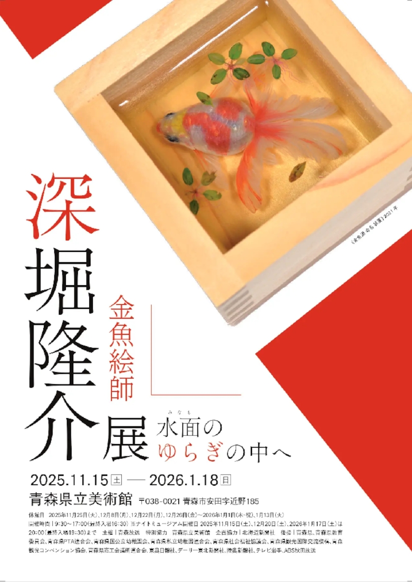 金魚に魅せられ、創作を続ける美術作家・深堀隆介(1973〜)。透明樹脂にアクリル絵具で何層にも重ねて描く「2.5Dペインティング」とも称される斬新な技法により立体感のある金魚を作り出してきた。初期の立体作品から、絵画、映像、大規模なインスタレーションなど新作を含む作品約300点を一挙に紹介。深堀が一貫して取り組んできた金魚の造形にあらためて光をあて、描くこと、リアルであることに対する作家の思想に迫る。