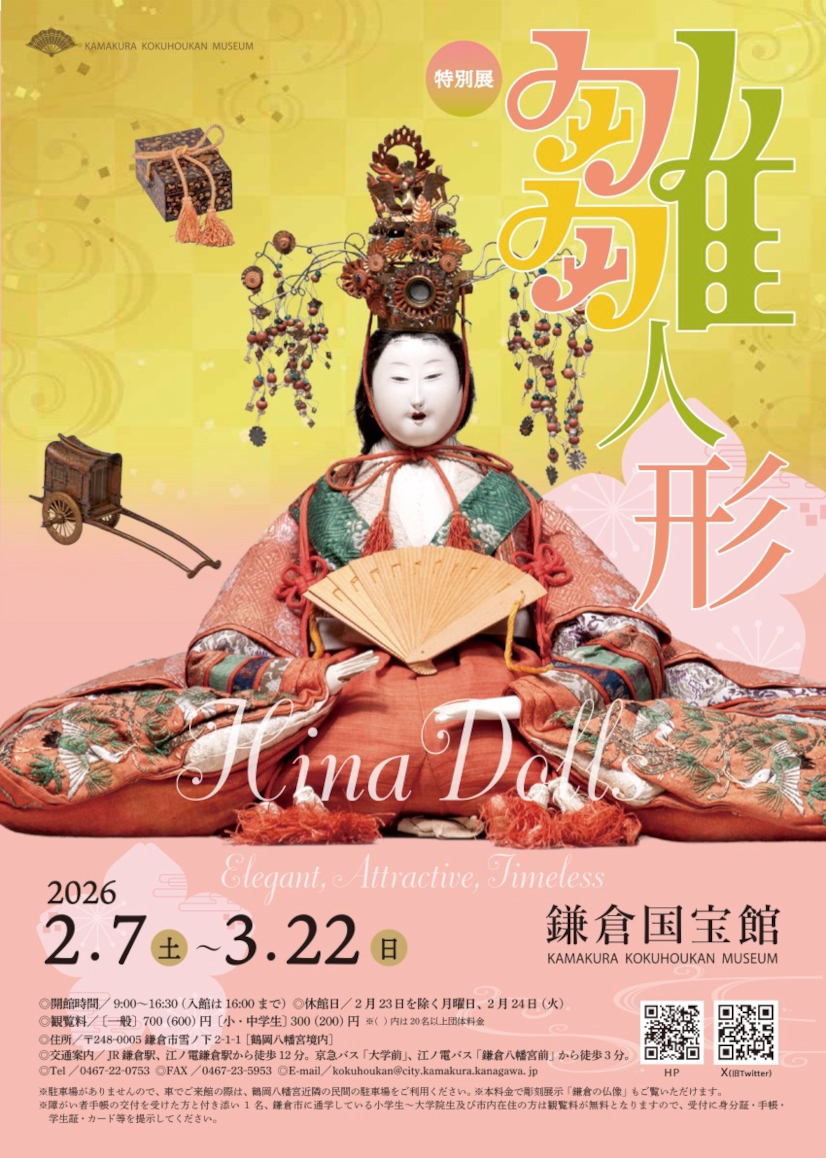 鎌倉国宝館の雛人形コレクションは、その大部分が江戸時代の作品。享保年間より流行した能面のような顔立ちの享保雛や、箱書に年紀が記され製作年のわかる資料的価値の高い古今雛、雛人形の古形とされる立雛など、多様な形式を見ることができる。種類豊富な雛道具、とくに蒔絵やガラス、陶器などで精巧に細工されたミニチュアの調度品類は見どころのひとつとなっている。総展示数約50件。